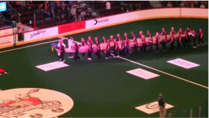 The evening was an incredible experience for us all. When the players went onto the turf, we formed the “fan tunnel” with the cheerleaders. Then, at half-time, we paraded around the floor with our boat. At the same time, our “drummer,” Annie Pattison, sang a beautiful rendition of “Heroes.”